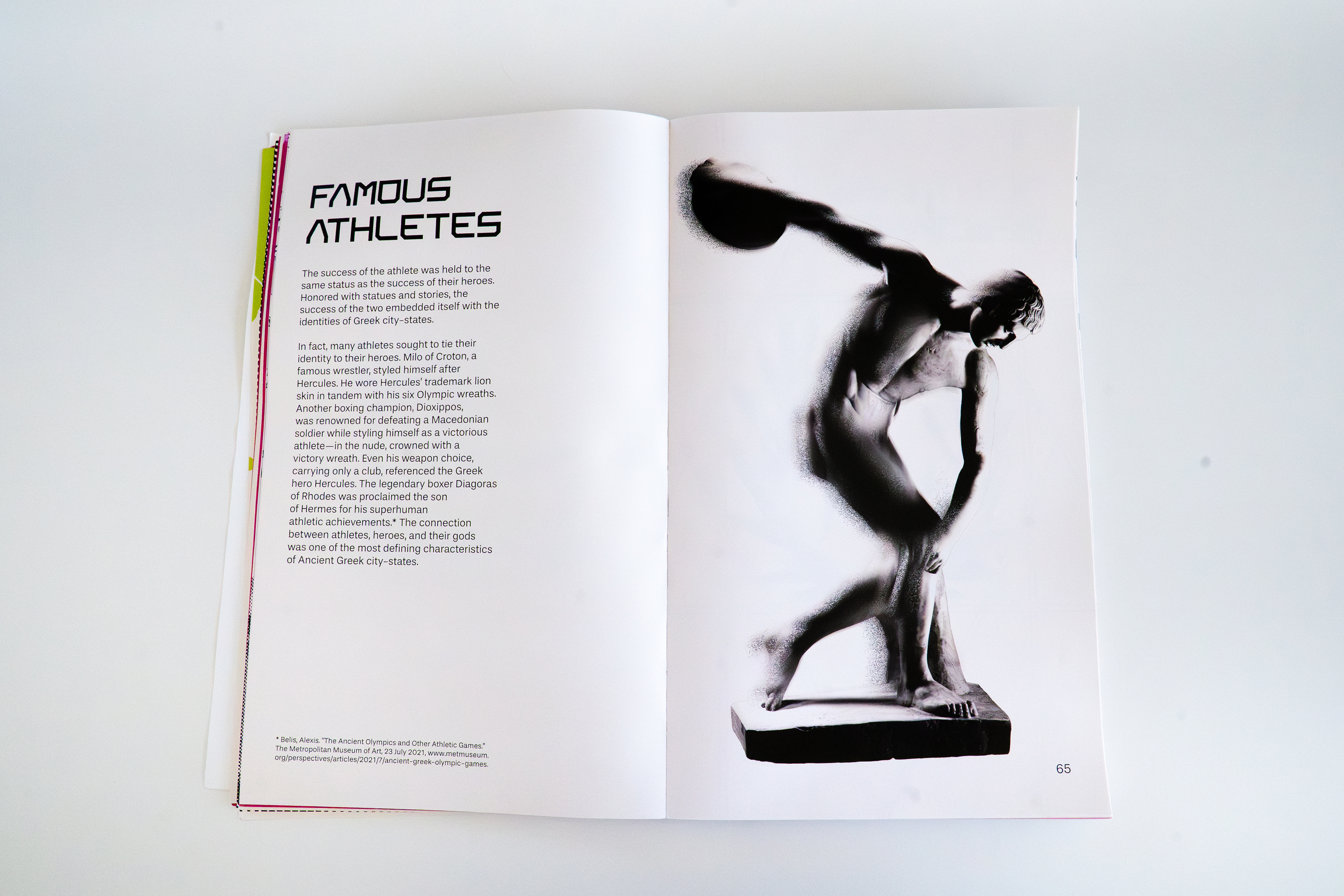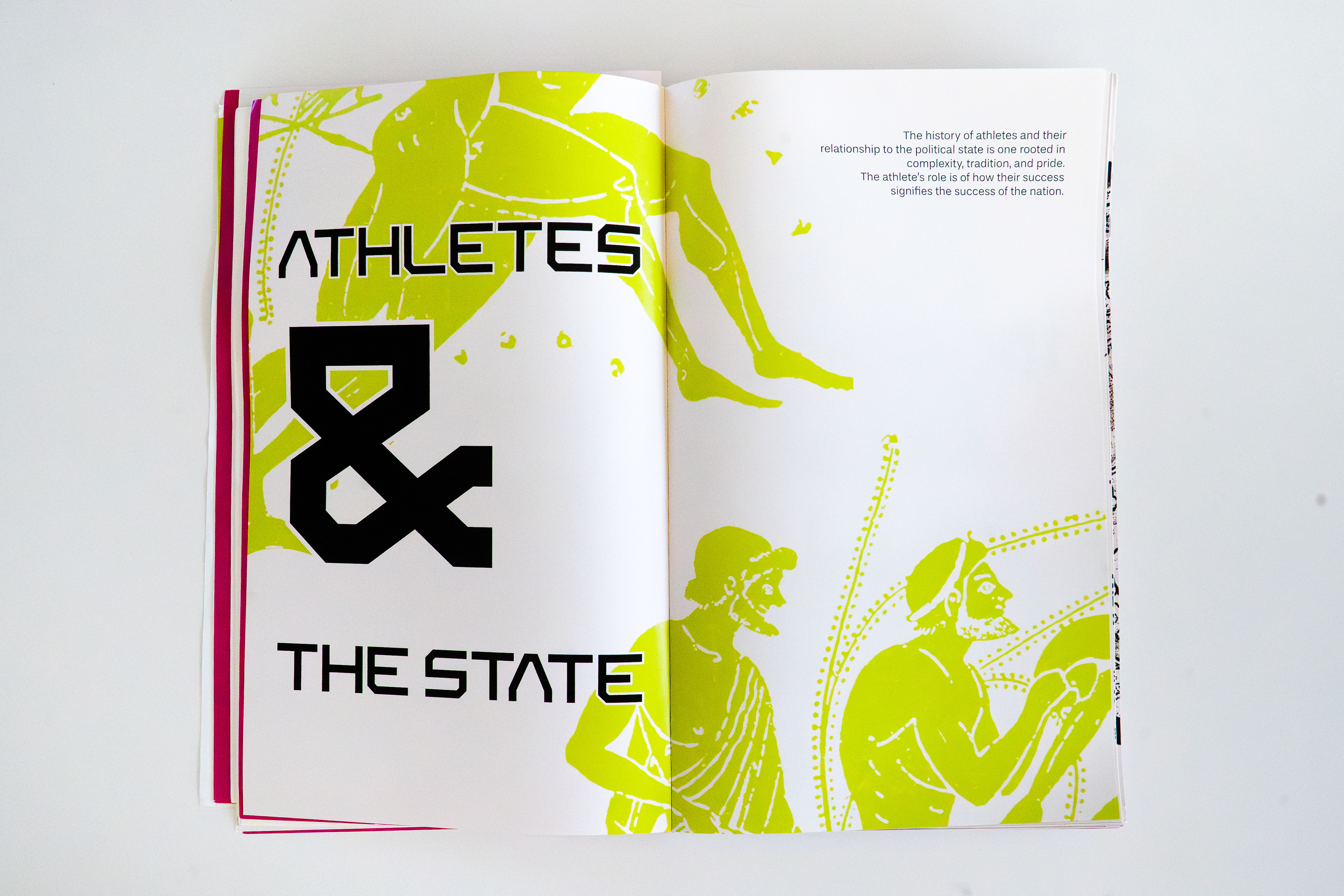 A 10x16 inch, 270 page, perfect-bound book exploring the political, cultural, and personal relationships and responsibilities of athletes from ancient times to modern day. Designed in Adobe Photoshop and Adobe Indesign.